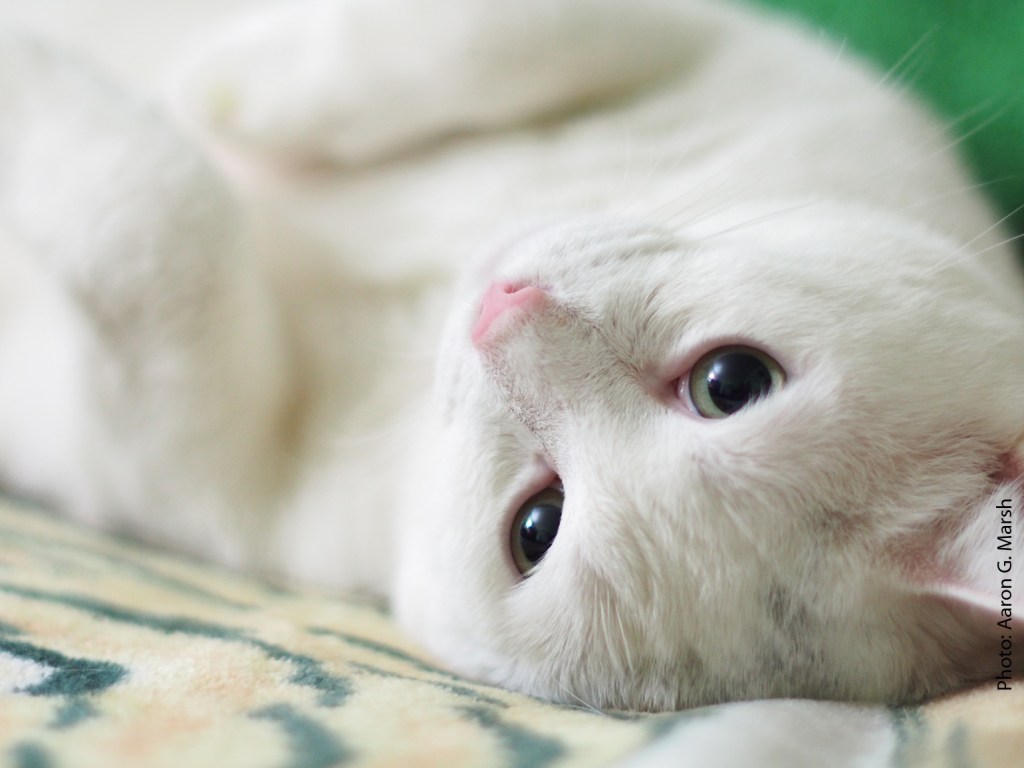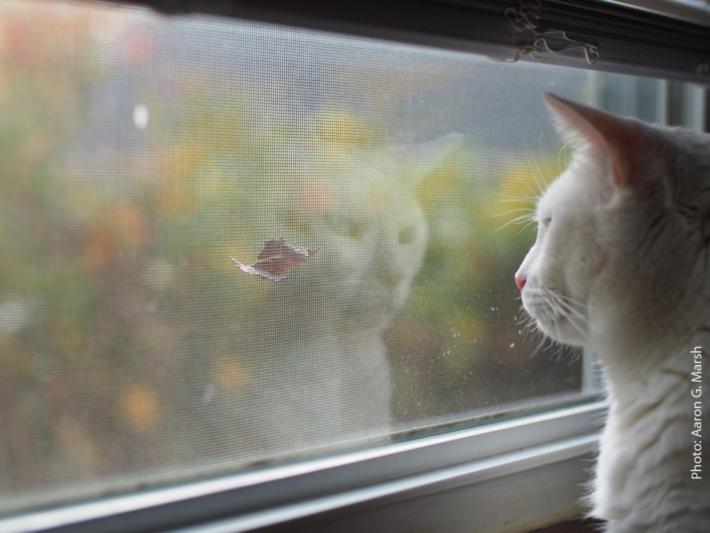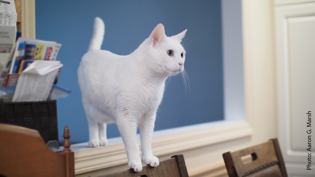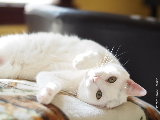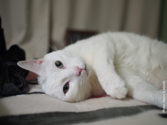 Interestingly, as we went to adopt this fellow, the woman who’d been fostering him and his two brothers, also white cats, showed us a video of soon-to-be-our cat opening a multi-part door lock to get into an attic. The lady considered this cat sort of a mastermind, the really smart leader of the group. The three brothers had been found in Stamford living under an old fire engine and totally caked up with mud and muck.