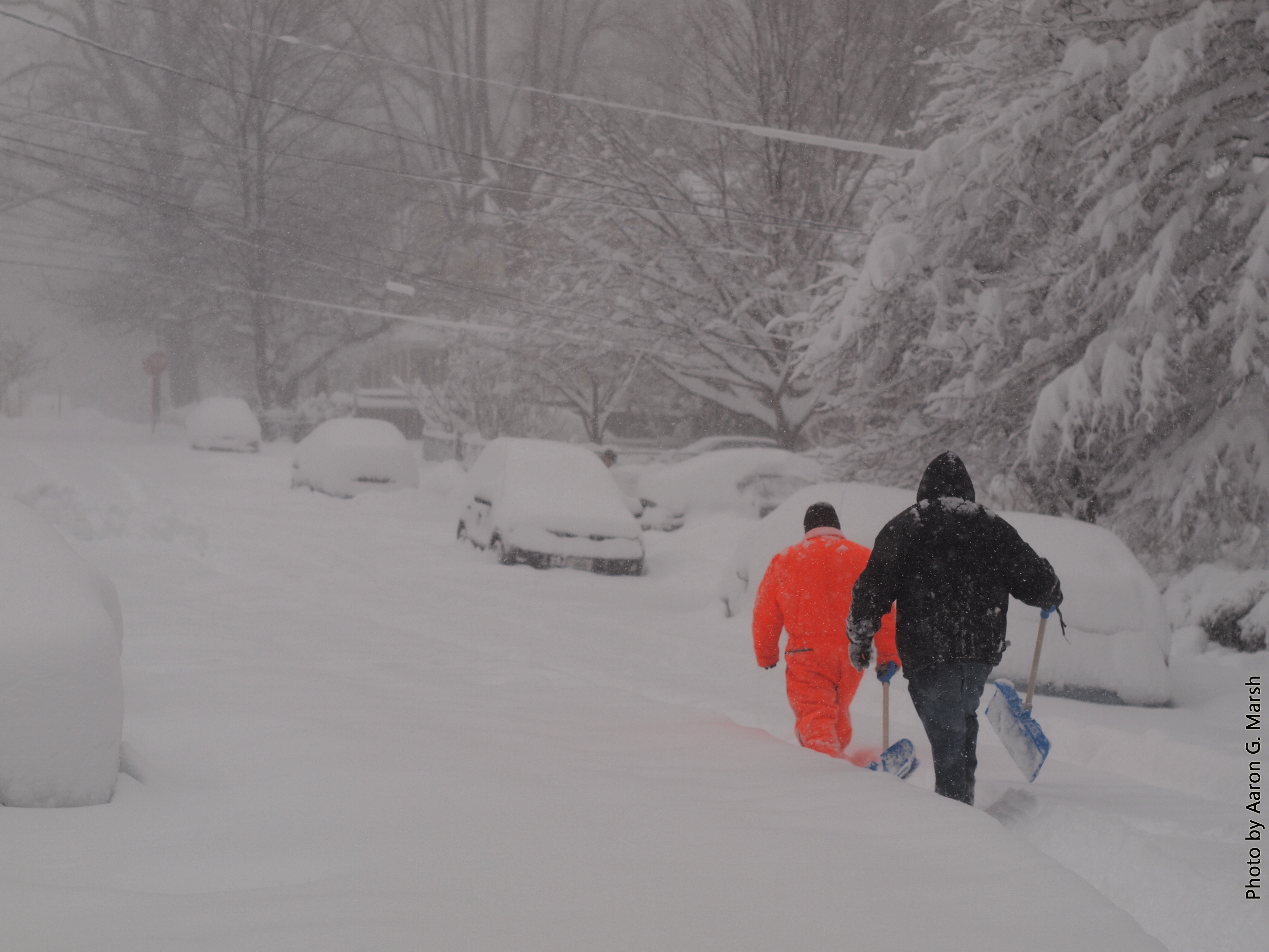 A "highlighter orange" or similarly bright-colored hat or overalls, etc. can help increase visibility and safety in the snow. Note which of these two shovelers stands out more in white-out snowstorm conditions. (Photo by Aaron G. Marsh)