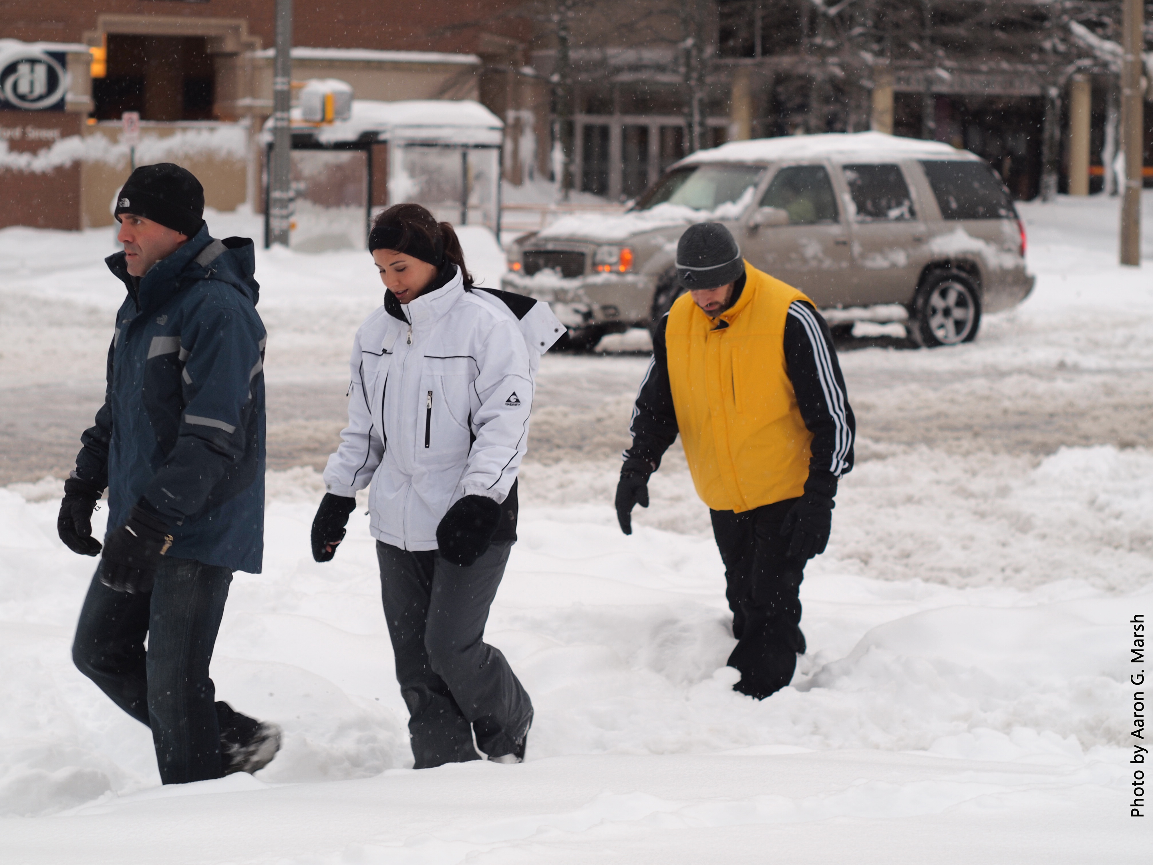 Use caution when driving on snowy roads near pedestrians. (Photo by Aaron G. Marsh)