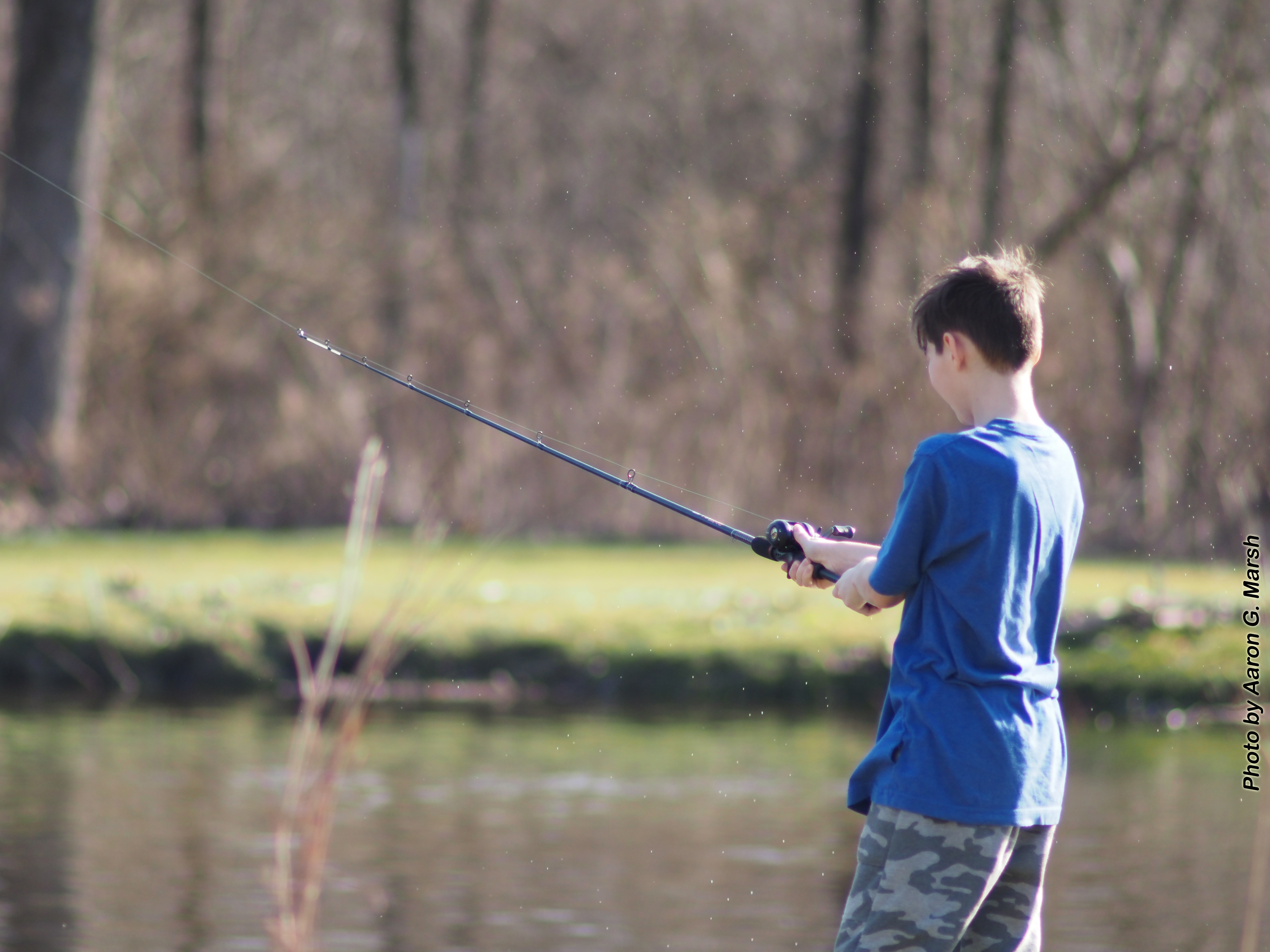 A boy casts his fishing rod into a pond on March 14, 2024. Click to enlarge. (Photo by Aaron G. Marsh)