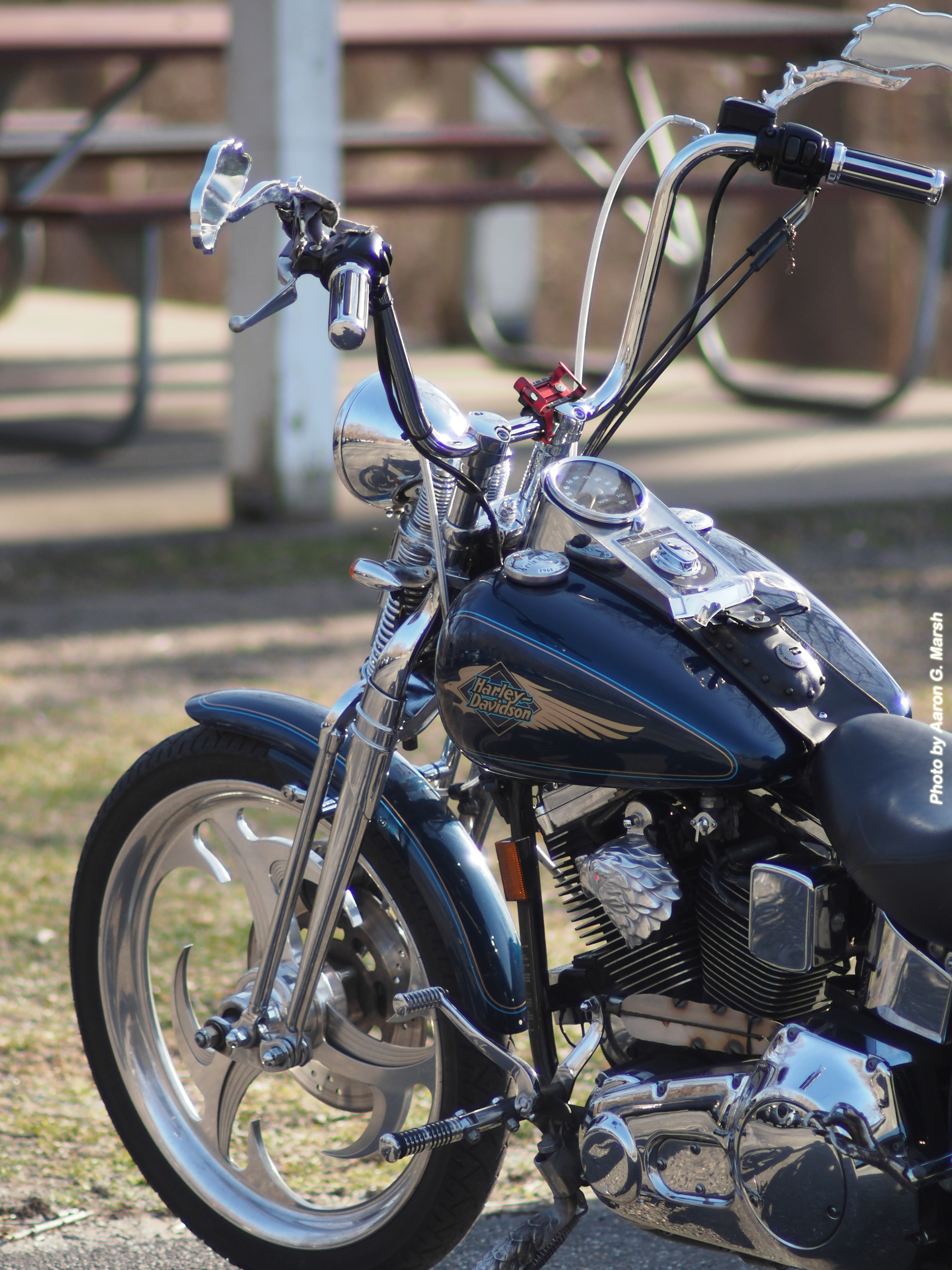 A Harley-Davidson motorcycle glistens in the sun on March 14, 2024. Click to enlarge. (Photo by Aaron G. Marsh)