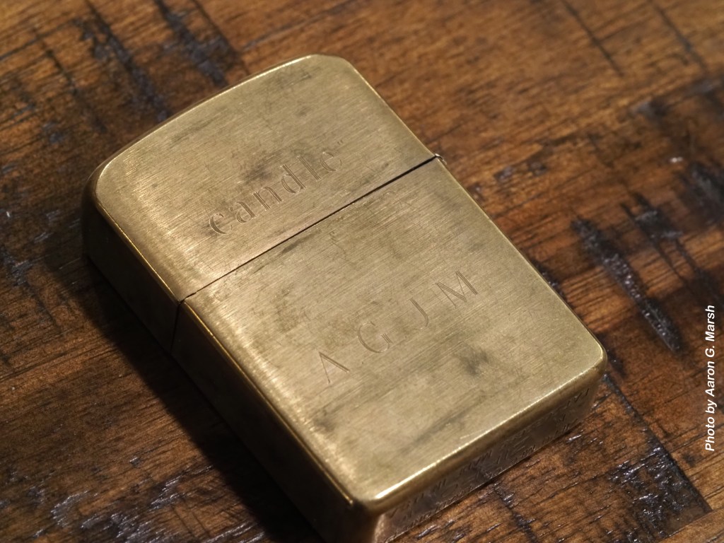The line, at least as I had remembered it, left such a mark on me that I had an all-brass Zippo lighter made up at one point engraved with the words, “Light of a single candle” and my initials, “AGJM.” I still carry it sometimes, and it’s very well-worn now, such that the engraving is difficult to make out. See if you can still read it in these photos.